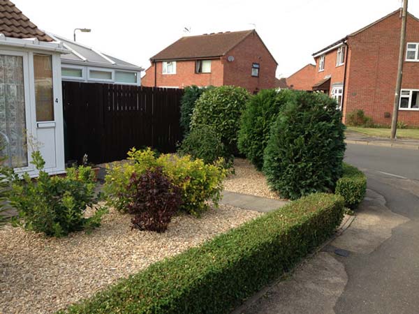 Firstly, we brought the privet hedge back into line and reshaped the conifers to bring a little space between them and lower the height.