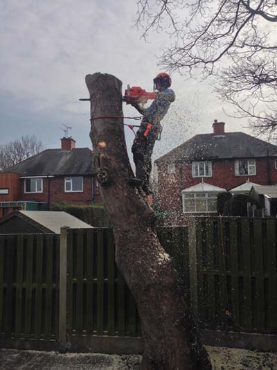 This sycamore tree in Norton Lees, Sheffield was precariously above multiple targets, including a shed, fence, paved patio area and a hedge. For these reasons we decided to use our rigging kit to allow for a more controlled dismantle, and to ensure that none of these targets were damaged in any way. After removing the crown of the sycamore tree, we proceeded to dismantle sections of the stem until we could drop the larger rings onto the small area we were able to use safely.
